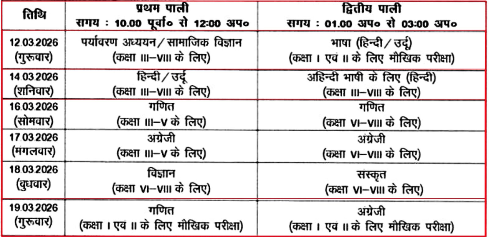 Bihar Board Class 1 to 8 Annual Exam Time-Table 2026