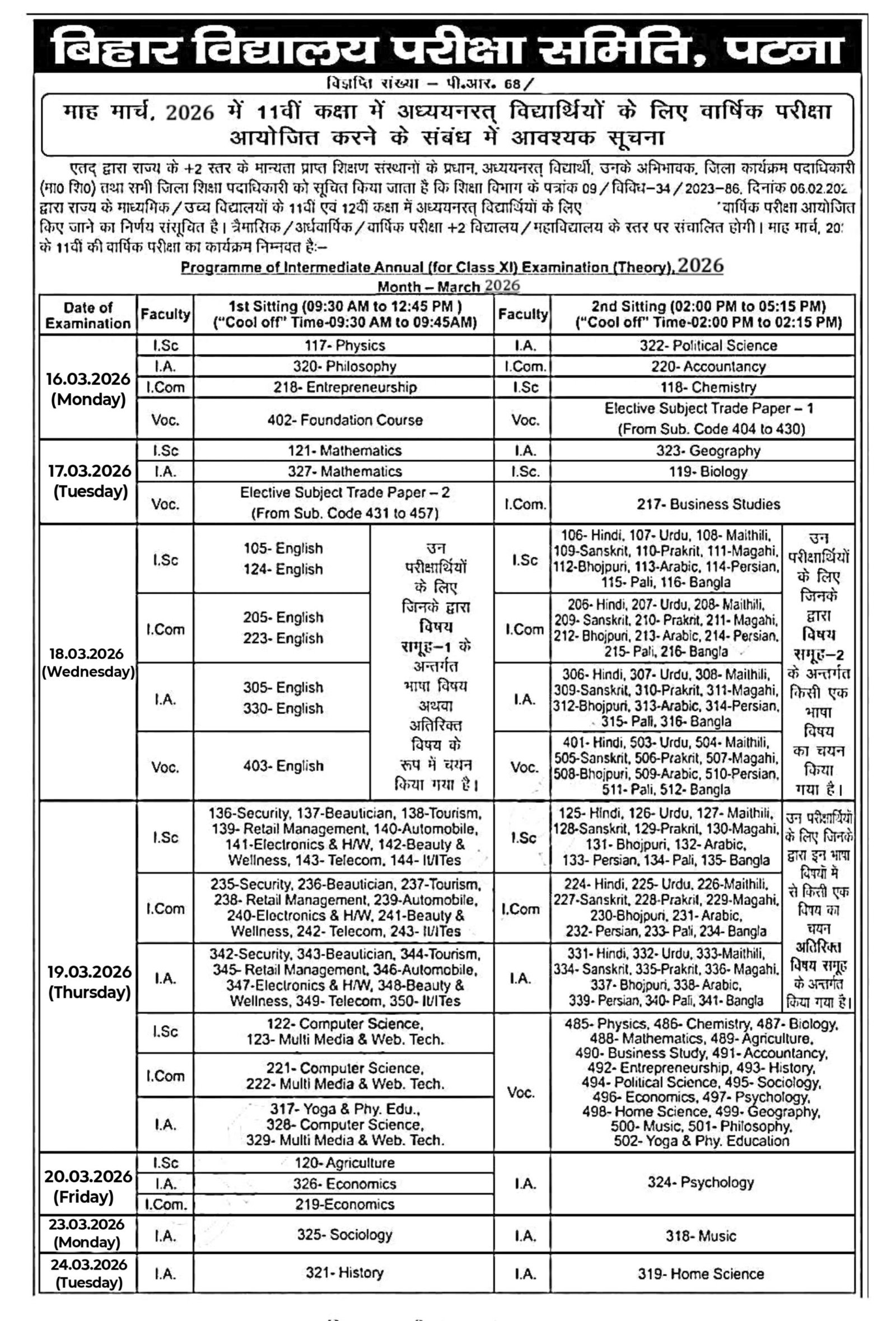 यदि आप भी कक्षा 11वीं के विद्यार्थी हैं तो आप सभी को बता दे कि बिहार बोर्ड के द्वारा आपके स्कूल और कॉलेज में मार्च माह में वार्षिक परीक्षा का आयोजन होने वाला है और आपको बता दे की कक्षा 11वीं की वार्षिक परीक्षा 16 मार्च 2026 से शुरू होगी और 24 मार्च 2026 तक कक्षा 11वीं परीक्षा चलने वाली है।