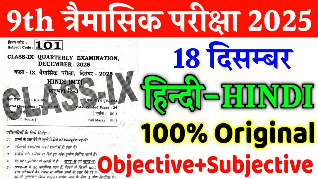18 December Bihar Board Class 9th Hindi Original Question Paper Quarterly Exam 2025 18 दिसम्बर बिहार बोर्ड कक्षा 9वीं के